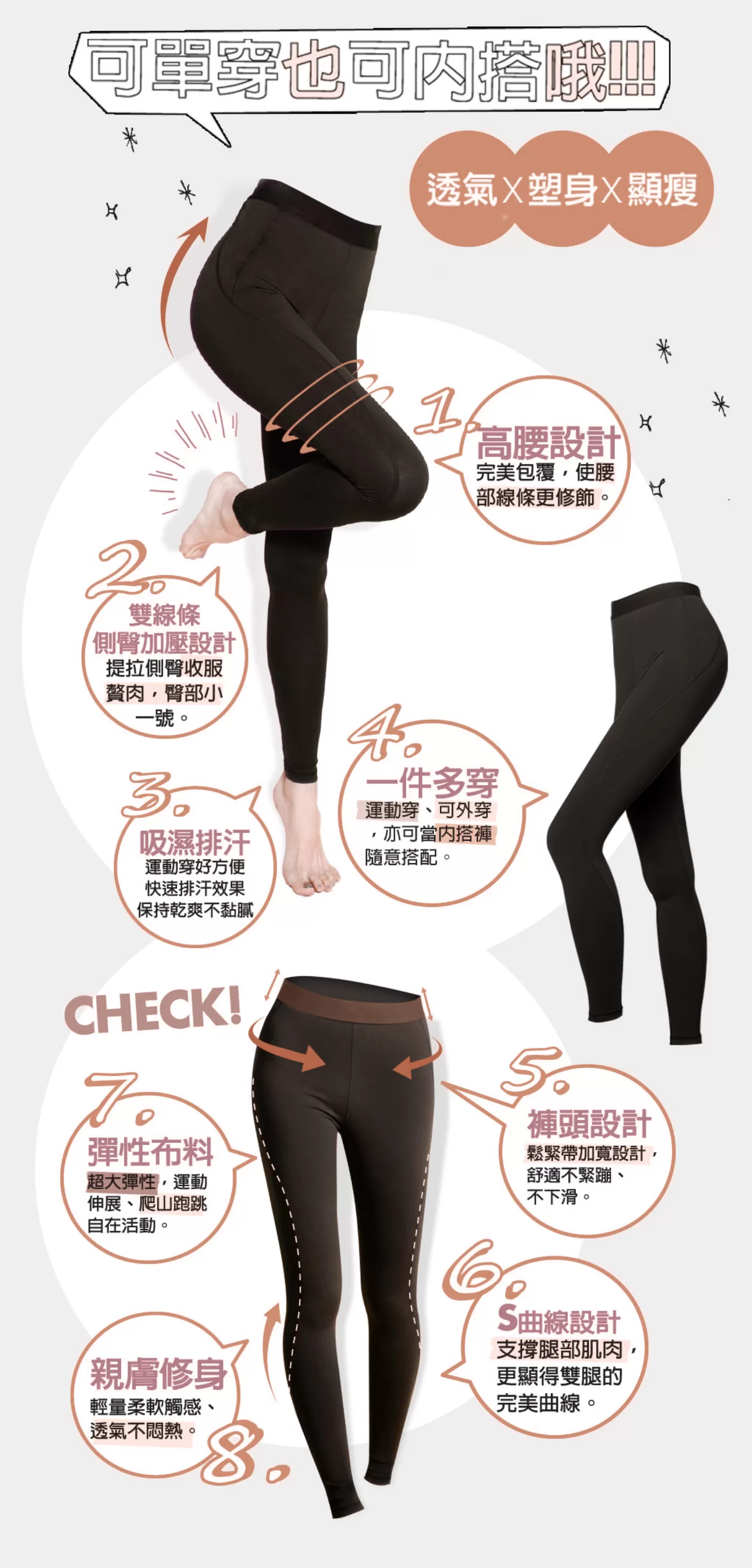 — 完美包覆:貼合腿部肌肉、平順線條,打造修長美腿比例。